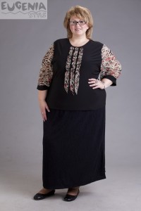 Основная ткань черного цвета. Вырез горловины полукруглый. Рукава из полупрозрачного шифона. В тон которым блузон украшают 3 рюши, красиво собранные “гармошкой”.