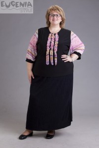 Основная ткань черного цвета. Вырез горловины полукруглый. Рукава из полупрозрачного шифона. В тон которым блузон украшают 3 рюши, красиво собранные “гармошкой”.