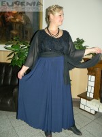 Вечернее платье для пышных красавиц призвно максимально подчеркнуть их достоинства. Лиф платья выполнен из красивого черного гипюра с паетками, из под которого просвечивает подкладка из той же ткани, из которой выполнена широкая юбка-шестиклинка. Втачные рукава расширяются к низу и выполнены из черного шифона. Из него же изготовлен и пояс-бант, который при желании можно подвязать под грудью.