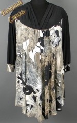 Очаровательная туника с V-образным вырезом. Неординарный покрой кокетки, симметричный линии низа и складочки, заложенные параллельно вырезу, придают очарования. Для дам, желающих скрыть свои достоинства, вырез можно заколоть красивой брошью, которая идет в подарок. От кокетки заложены складки, что позволяет рекомендовать данное изделие дамам с пышными бедрами. Длинный рукав на широком манжете.