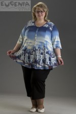 Блузка-пиджачок. Расклешенная к низу, подойдет дамам с пышными бедрами. Впереди планка на пуговицах. Кокетка из того-же принта, что и низ изделия.Короткий рукав мягкая и приятная к телу. Можно носить комплектом с топом из этой же ткани.