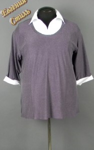 Состав: белая ткань – хлопок 95%, эластан 5% (хлопок со стрейчем), основная ткань – шерсть14%, вискоза 81%, эластан 5%. Джемпер с эффектом два-в-одном предназачен прежде всего для дам, которым приходится работать в офисе с дресс-кодом. Рукава втачные, длиной в 3/4, заканчиваются манжетами из той же ткани, что и воротничок.
