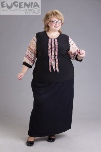 Основная ткань черного цвета. Вырез горловины полукруглый. Рукава из полупрозрачного шифона. В тон которым блузон украшают 3 рюши, красиво собранные “гармошкой”.