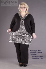 Блузон-туника. Простота фасона с лихвой окупается оригинальностью кроя. Состоит из мягкого трикотажного полотна двух расцветок. Черный фон оттеняет “архитектурный стиль”, что в сочетании с вертикальной полосой зрительно делает фигуру стройнее.