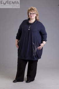 Теплая, мягкая и уютная ткань. Имеет нижние карманы. Воротник-хомут, от которого заложена встречная складочка, украшенная красивыми пуговицами. Низ изделия освежает рисунок из страз. Рукав в 3/4 собран на резинку.