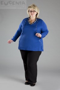 Джемпер. С длинным рукавом ярко-синего цвета. Украшен втачным вертикальным пестрым кантом. V-образный вырез горловины так же оторочен пестрой тканью, уложенной в складочку.