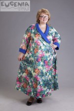 Тепленький халатик со стегаными рукавами и манжетами. Из яркой двухслойной ткани (верх с атласным эффектом, низ – хлопковое плетеное волокно), отороченный ярко-синими манжетами и воротником-шалькой. Пошив на запах, пояс вдевается в симпатичную пряжку. Рукава 3/4. Большие карманы.