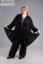 Черный широкий кардиган с втачным поясом, что позволяет манипулировать внешним видом. Поясок можно завязать как спереди, что позволит подчеркнуть либо красоту самой накидки, либо оттенить нижний наряд, подвязав пояс сзади. Передние полочки от линии плеча заложены в складки. Низ уходит на угол. Одна из полочек урашена декоративной деталью. Широкие укороченный рукава с большой проймой.