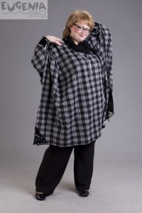 Модель цельнокроеная. Воротник, широкий хомут, дополнен двойной вертикальной кулисой, что позволит Вам менять его форму по своему вкусу. Рукава собраны на широкие манжеты, с внешней стороны отделанные тканью под кожу. В манжетах кулисы с эластичными завязками. “Уголки” пончо декорированы вставками из ткани под кожу и пуговицей с завязками.