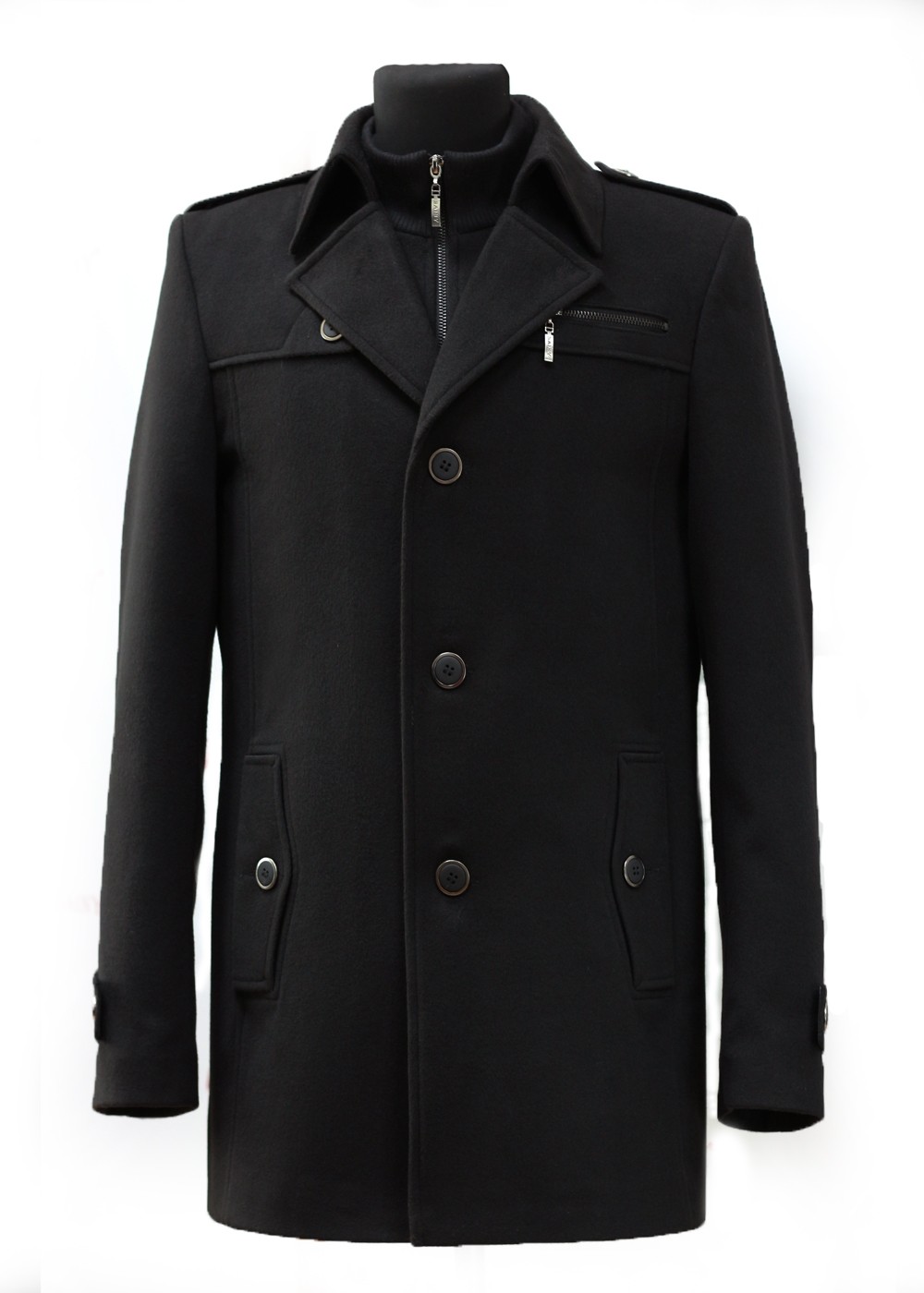 Мужское молодежное пальто полуприталенного силуэта. Отложной воротник дополнен воротником-стойка и планкой на молнии. Длина по спинке для роста 176см - 81см, для роста 182см - 83см.
