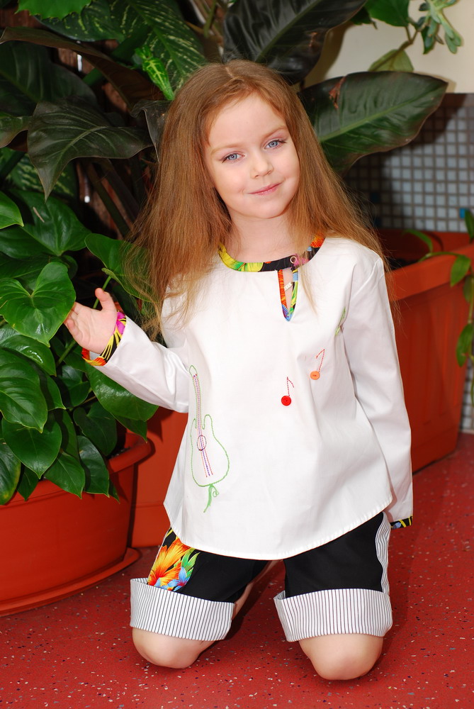 Оригинальные детали рубашки: вышитая гитара, нотки и отделка красивой тесьмой порадуют ребятишек, которые оценят также и свободный покрой, не стесняющий движений. А родители оценят удлиненный низ и рукава, хорошо защищающие нежную детскую кожу от солнца. Благодаря чистому хлопку и белому цвету в рубашечке совсем не жарко. Подходит и для мальчишек и для девчонок