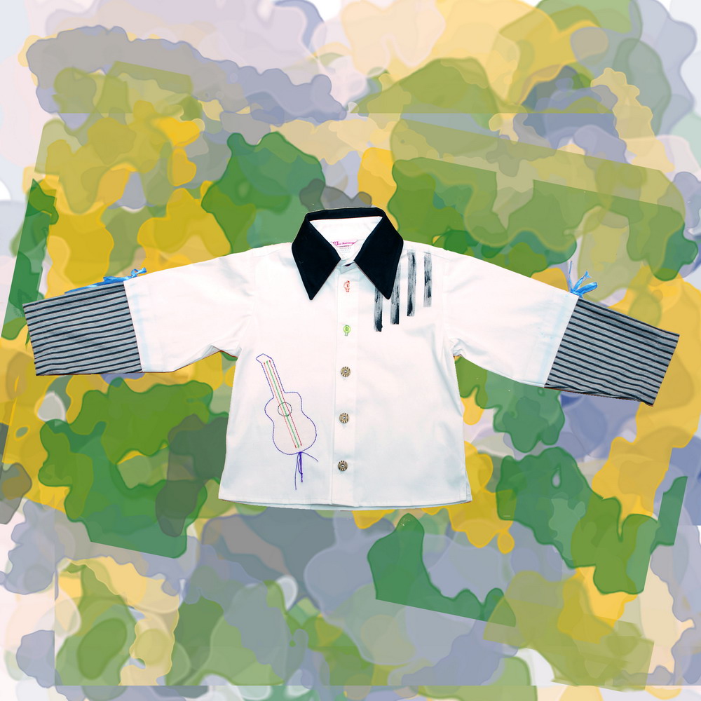 Эта рубашка для самых креативных! Те, кто не намерен скучать, обязательно оценят вручную нарисованные полоски, необычные петли в цвет пуговиц и, конечно же, вышитую гитару! А еще необычные шнурочки на рукавах, которые можно менять по настроению