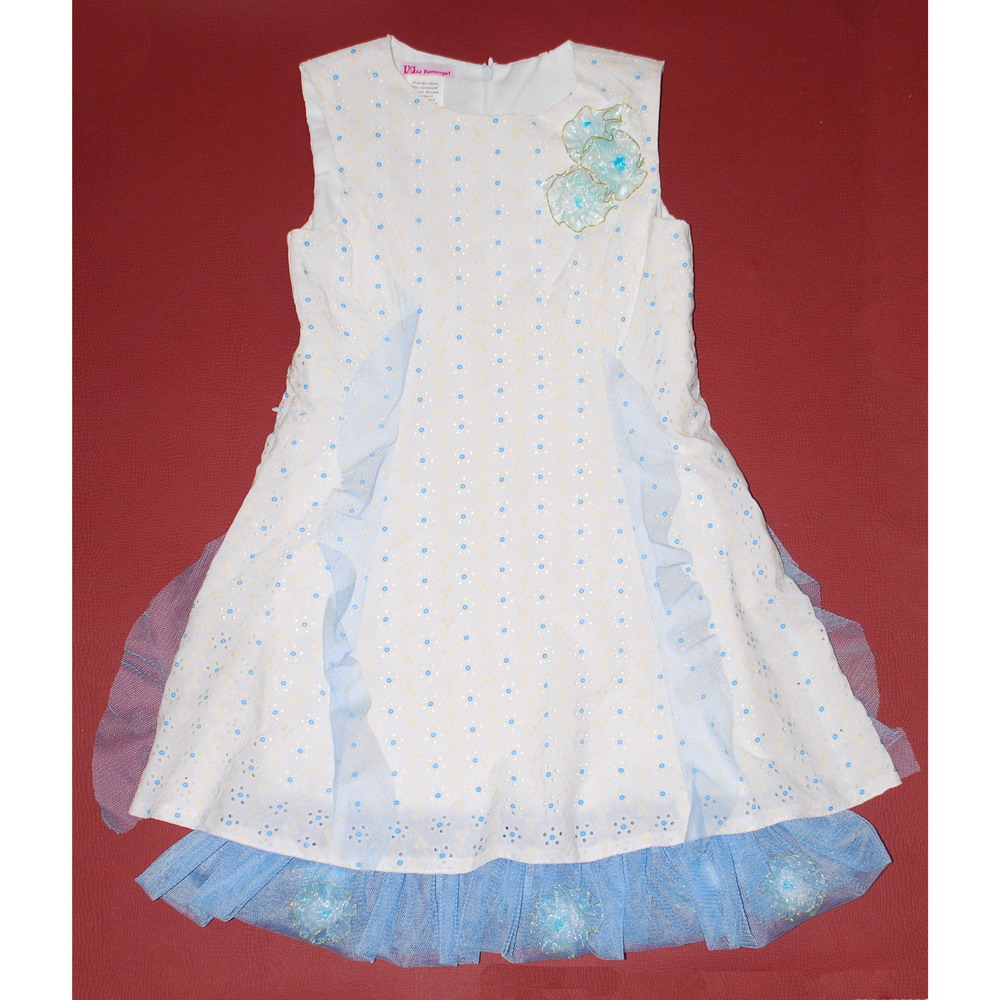Милое платье с нежно-голубыми цветочками и почти невесомыми воланами. В нижней юбке спрятаны нарядные голубые цветочки. Все воланы начинаются на разной высоте, сзади – на уровне лопаток, как настоящие крылышки