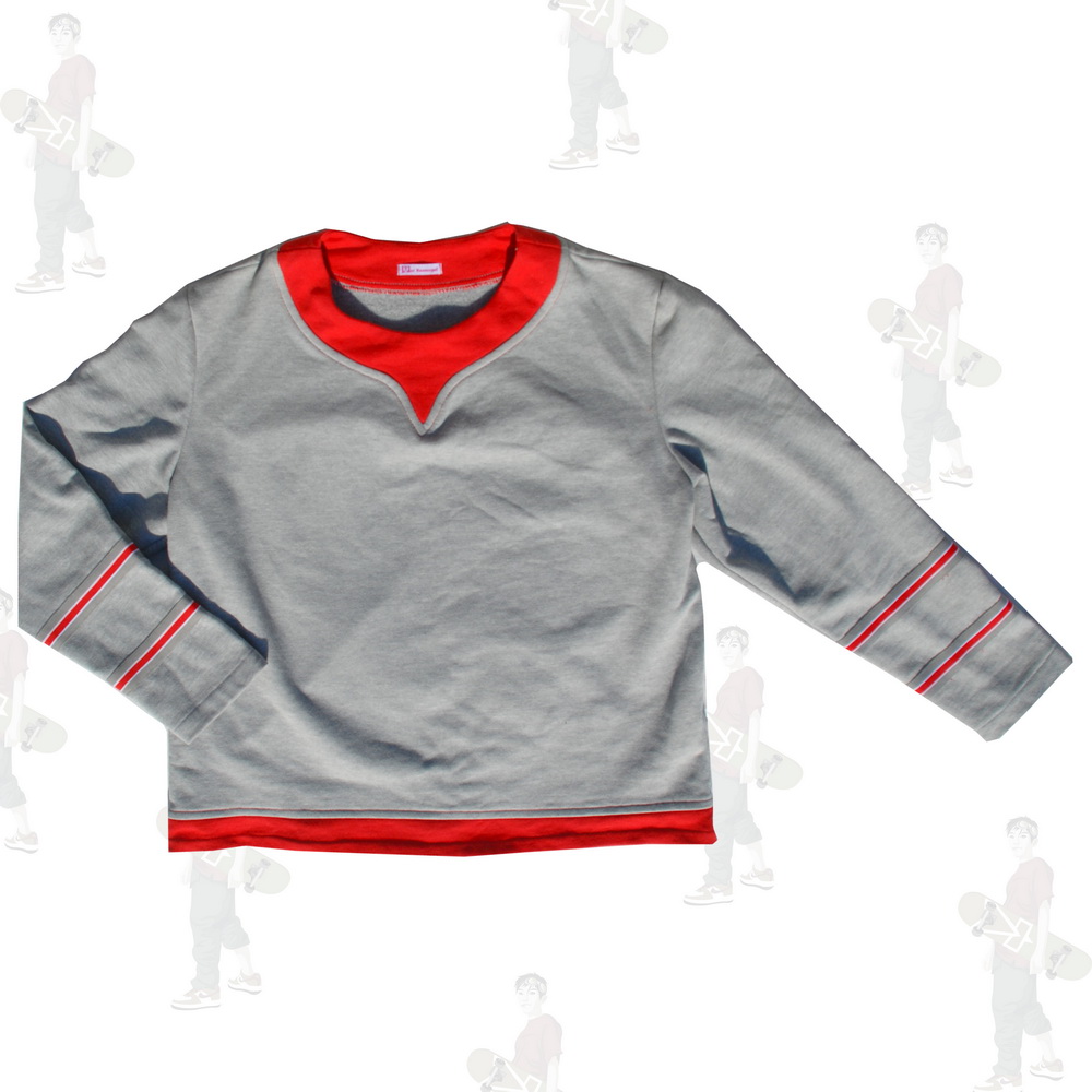 Для тех, кто не любит слишком яркое - спортивная фуфайка в спокойном сером цвете. Но спорт - это радость. Поэтому серый цвет мы слегка "разбавили" красной отделкой