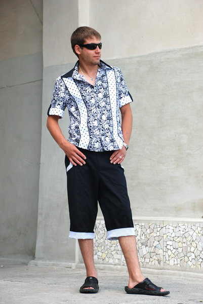 Черные мужские шорты - хит для любого мужчины. Необычные двойные карманы сзади, пояс - резинка и возможность изменять длину с помощью полосатых подворотов делают эту модель максимально комфортной