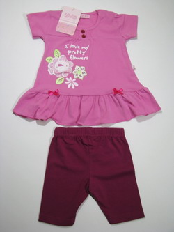 Симпатичный летний комплект для девочки: удлиненная туника с красивой отделкой и яркие практичные тайцы на резинке.