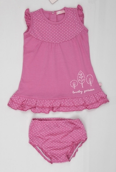 Яркое, кокетливое платьице для маленькой принцессы! Имеет короткие рукавчики и округлый вырез горловины. Платье декорировано милыми оборочками и стильным принтом . Изделие имеет замечательные и комфортные трусики в комплекте.