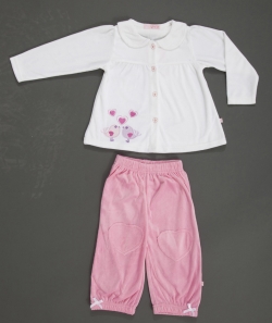 Великолепный велюровый комплект для юных модниц : жакет с длинным рукавом и оригинальной аппликацией, штанишки на мягкой резинке и пришитыми наколенниками никого не оставят равнодушным