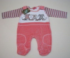 Комбинезон из мягкого велюра с длинным рукавом с ножками, застегивается на плече и между ножками на кнопочки по всей длине штанины, что делает переодевание очень удобным