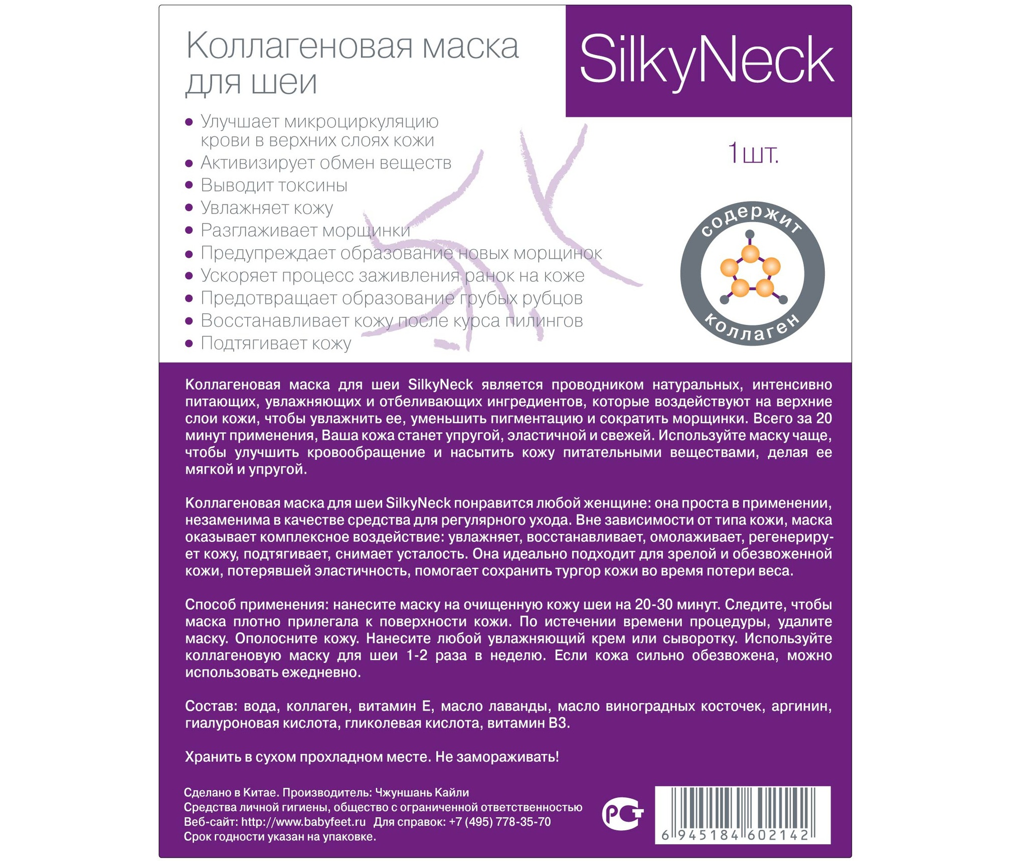 Коллагеновая Маска для шеи SilkyNeck является проводником натуральных, интенсивно питающих, увлажняющих и отбеливающих ингредиентов, которые воздействуют на верхние слои кожи, чтобы увлажнить ее, уменьшить пигментацию и сократить морщинки. Всего за 20 минут применения, Ваша кожа станет упругой, эластичной и свежей. Используйте маску чаще, чтобы улучшить кровообращение и насытить кожу питательными веществами, делая ее мягкой и упругой.